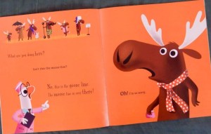 Under the direction of a rather bossy goose named Simon, a queue, no make that two queues, are forming outside an ice cream shop. There’s a goose line and a moose line. The trouble is the customers are having trouble getting in the assigned lines. Should I say it’s mainly the Moose that keep getting it wrong to the considerable annoyance of Simon Goose.
