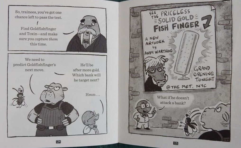 Then comes news of another case: the First Bank of New York has just been robbed and Interpol need their assistance. Eric Goldfishfinger and his pufferfish partner in crime have stolen 10 million $ in gold bars. Catching them is the next mission for the three trainees. The chase is on … Can they catch the fishy thieves before they get that priceless solid gold fish finger?