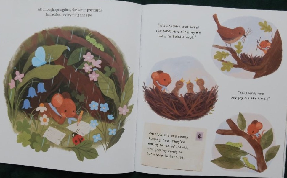 Flora spends the spring learning new things and writing postcards home about what she observes. She follows the development of new baby birds and caterpillars