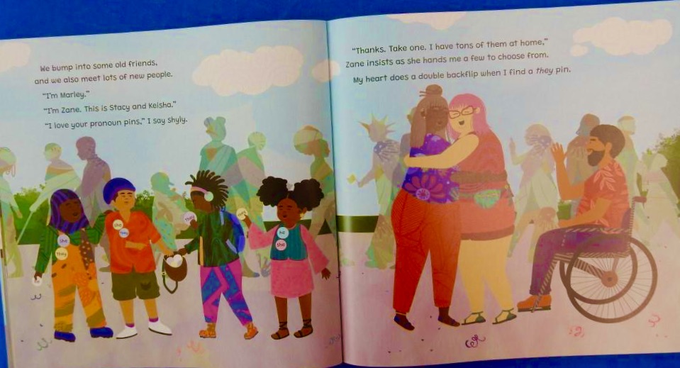 At the venue, just as things threaten to overwhelm Marley, Zaza’s reminder, “Pride isn’t just a big ole party. It’s about celebrating who we are, about community, and love” gives the child a boost of courage to go among the crowds. By the end of the day, Marley feels a part of that community with new friends