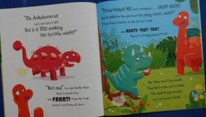 Three intrepid little explorers with their kit at the ready are on an expedition in the hope of finding something, something ‘REALLY big’. Dig! Dig! Dig! they go till one person discovers some remains of a sharp clawed dinosaur. These claws make the finder conclude that they belonged to a Velociraptor.