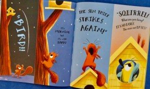 Come the evening Squirrel is feeling pretty dismal and off he goes to sleep. Not so Bear who disturbs Squirrel’s slumbers announcing that it’s playtime. An angry Squirrel tells Bear that the next day will be “DIFFERENT”.