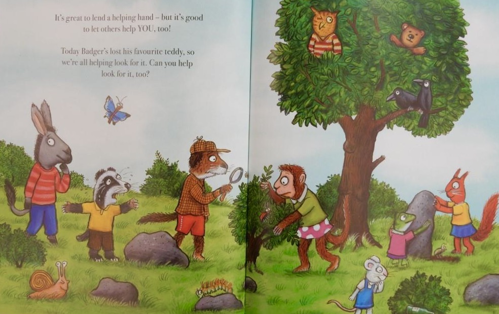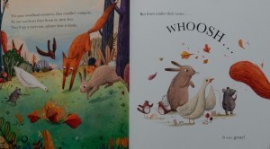 Karl’s rhyming text bounces along in dialogue form and in combination with Nia Havilliard’s dramatic scenes of the search and animal interactions, makes for a fun read aloud, one I’d suggest saving for the autumn to share with young children.