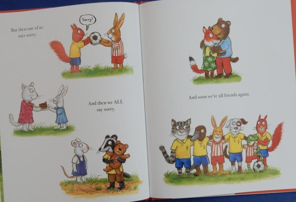 Squirrel and Bear are best friends, doing everything together. Being besties though doesn’t mean they enjoy the same things.and the huge difference in their size can sometimes cause issues regarding playing. One day Bear chooses only activities that Squirrel deems unfair. The tree climbing ends with Squirrel cascading into a bush, Squirrel isn’t a swimmer so the river fishing leaves Squirrel feeling left out and so it goes on.