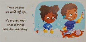 Our narrator is a member of a class of lively reception pupils and she is very welcoming and reassuring from the outset, for the teacher, Miss Piper, is in need of a lot of help. First she’ll struggle to remember names so needs to use a special list – the register and that’s before activities begin – activities such as ‘washing up’