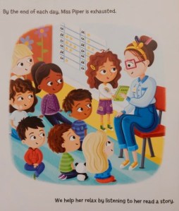 Come the end of the day, the children help an exhausted Miss Piper relax by listening intently to her as she reads a story.