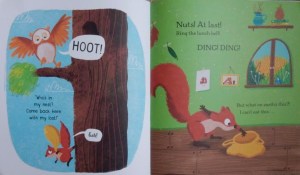 Off he goes again on his nut search, next stop Owl’s. Owl seems to be out so up the tree goes Squirrel, ‘Sneakily, Sneakily, Snoopily …’ Squirrel makes off with a sack of … nuts, he expects. But …