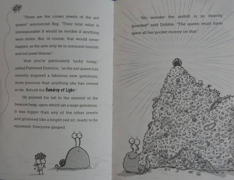 Full of zany drawings, a choose your own adventure chapter, a poem about custard and much more including a smashing supporting cast, the entire story is absolutely bonkers and enormous fun. On the serious side, the author aka Professor Crispin T. Earthworm has provided some fascinating bug facts and there are ideas for readers to create their own fantasy stories and a game.