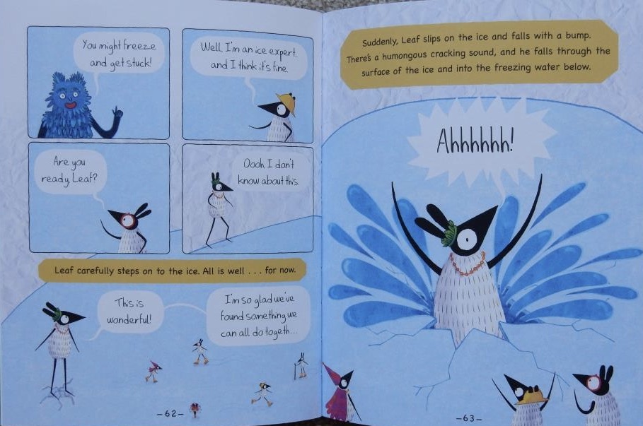 It’s ice-skates rather than skis that the Floofs try out in A Different Kind of Floof. Almost inevitably though, one of their number, Leaf, bumps down hard on the ice, falling through