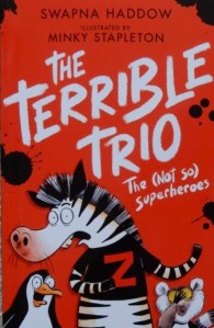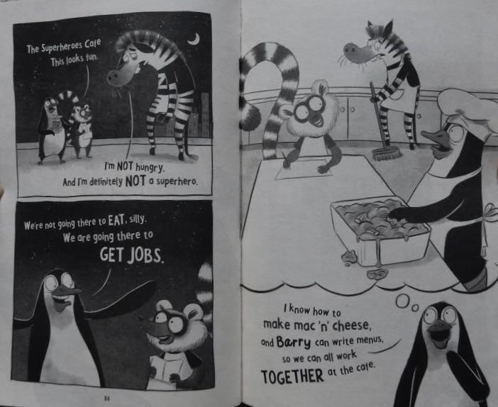 The terrible trio comprises Margarine the Penguin, Zeb the Zebra and Barry the Lemur. We meet them as they stand in line eagerly waiting to reach the front as it’s the day when a superpower will be bestowed on each and every animal. The line is a very, very long one and is moving very slowly so there’s plenty of time for them to ponder upon the power they’ll be given. Zeb wonders about speed, strength or the ability to see the future. When the buffalo bum in front of them eventually moves off, he’s let’s say, disappointed to hear from the Ministry Superpower Manager that he’s “all out of powers”. However they manage to persuade the power giver-outer squirrel that they must take priority over his favourite tv show and finally Penguin receives ‘the power to make mac, n’cheese’, Barry receives the power of nice handwriting, but what about Zeb. To him, his superpower feels pointless.