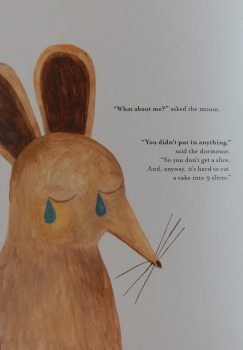 “How many slices should I cut?” asks Owl. All who contributed an ingredient must surely get a piece but what about Mouse. Surely he won’t be left out; or will he?