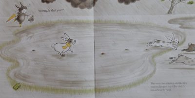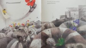 but pretty quickly Squirrel realises that his friend’s absence has created huge gap to fill in his heart and mind … ‘I MISS BEAR!’ comes the cry and out dashes the rodent imploring Bear to return.