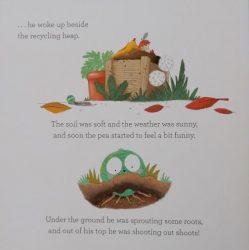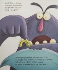 Ben Mantle’s comical scenes are rich in detail – daft and otherwise. Who can fail to giggle over the sight of McDarkly sitting atop a bush outside his home sipping tea from a china cup, or that of the creature singing to his plants.