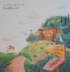 Russell is certain there’s more to life than muddy fields and pigpens so he starts hatching a plan. A plan that involves, an upturned pigpen, some twisted hedgerow twine, some broken branches and some very tricky cliff -edge manouevering but by the following evening he and his two companions are heading off into the sunset. Well, that was what they thought. However, the world outside the farm is much more dangerous that the three pigs had anticipated especially when they start receiving ‘join us for dinner’ invitations. So will the porcine trio end up as pork chops or can they find that perfect place with all the apples and truffles they can eat after all?