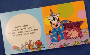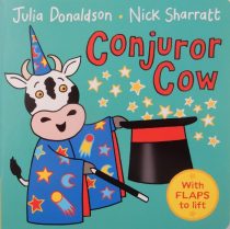 Although Julia Donaldson’s rhyming in this lift-the-flap- book is impeccable, Conjuror Cow’s magic skills are decidedly lacking as she makes several abortive attempts to produce a white rabbit from her top hat, a cake, a trap door in the floor and a snazzy table cloth,
