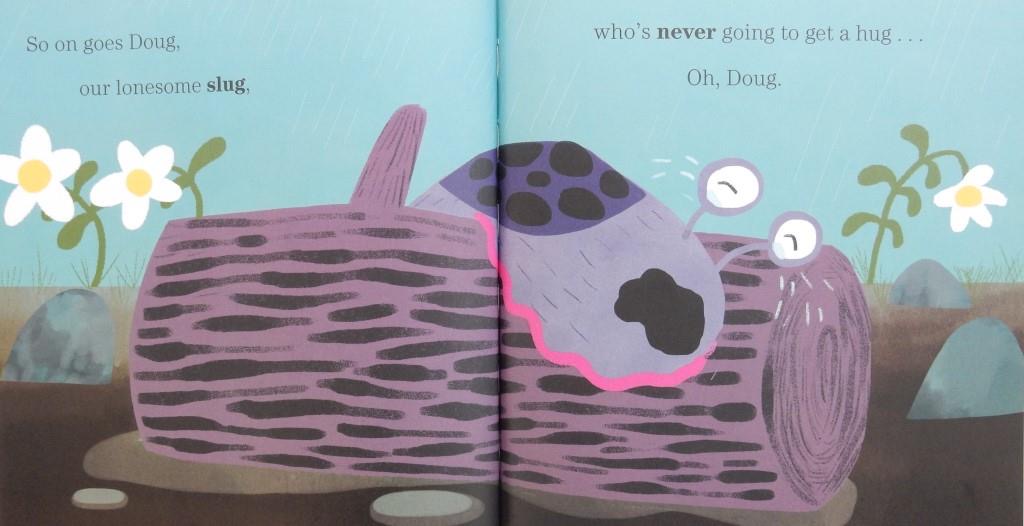 Meet Doug, a slug that’s feeling rather lonesome; he would really love a hug. (Wouldn’t we all?) But just imagine hugging a slug – not a very pleasurable prospect me thinks. So agree the various minibeasts he encounters. There’s earthworm, spider, ant, caterpillar each of which beats a hasty retreat; but not before uttering some thoroughly disheartening words.