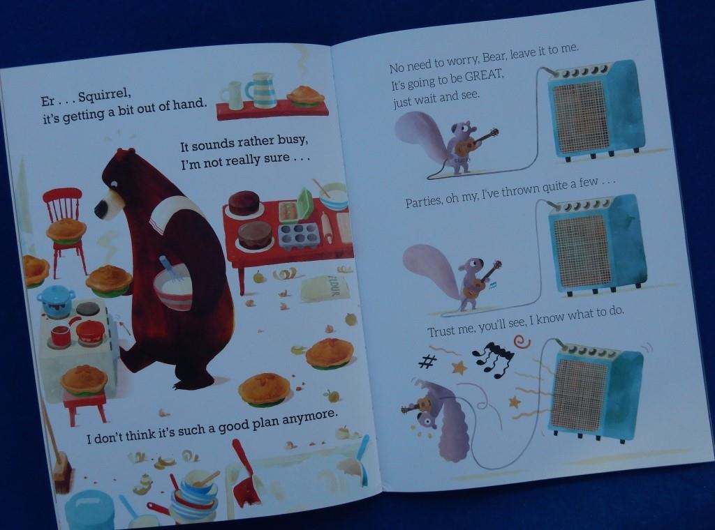 Best friends Bear and Squirrel return in story number three wherein Squirrel suggests they throw a party and Bear, somewhat reluctantly agrees, leaving Squirrel to take the lead in its organisation.