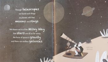 ‘Unmanned Space Exploration’ that uses probes and contemplate ‘Life on Other Planets’. Each of these (and other fascinating subjects) is given a large, mostly visual double spread illustration by Tom Clohosy Cole onto which is superimposed an introductory paragraph and other snippets of information from lecturer in astronomy and physics, Dr Christoph Englert.