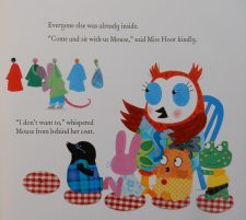 On Matilda’s first day at The Meadows she wakes up excited at the prospect of starting school and her upbeat mood continues all the way to the school door as she and her Mummy sing together, jump over bubbles and count birds. However when they arrive Matilda’s tummy feels ‘all squirmy’. Her mum gives her a reassuring hug but Matilda finds saying goodbye very difficult. Moreover, she’s at a loss to decide what to play when her teacher, Miss Cartwright, asks. Eventually she plays with small world dinosaurs with Ana and draws pictures beside Leo but nothing stops her missing her mum.