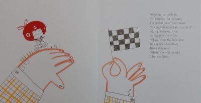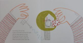Interestingly we never see the complete dad, or even indeed his face. Rather it’s only huge hands, or feet and legs on the final page, that are ever visible. In this way, Christine Roussey emphasises the huge amount of love he bestows upon the small narrator and the scope of his influencing power upon her feelings and emotions.