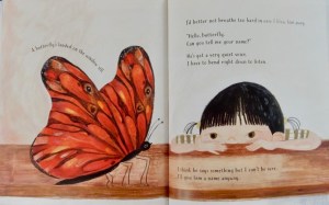 The little girl narrator of this story is at home and bored without anybody to play with. Suddenly there comes a tap on her window: it’s a bird the name of which she doesn’t know. So she asks and the response is ‘I’m a magpie, darlin’ … ‘ On hearing that this bird is also a jewel thief and receiving an invitation to surprise him with another name, the child suggests Diamond Dodger. From its response she assumes the bird is pleased at this. What follows is a lovely imaginative game wherein the girl thinks up new names for in turn, a tall tree close by. Emerald Queen, that one becomes, followed by a butterfly that lands on the window sill – I wonder what you’d call it –