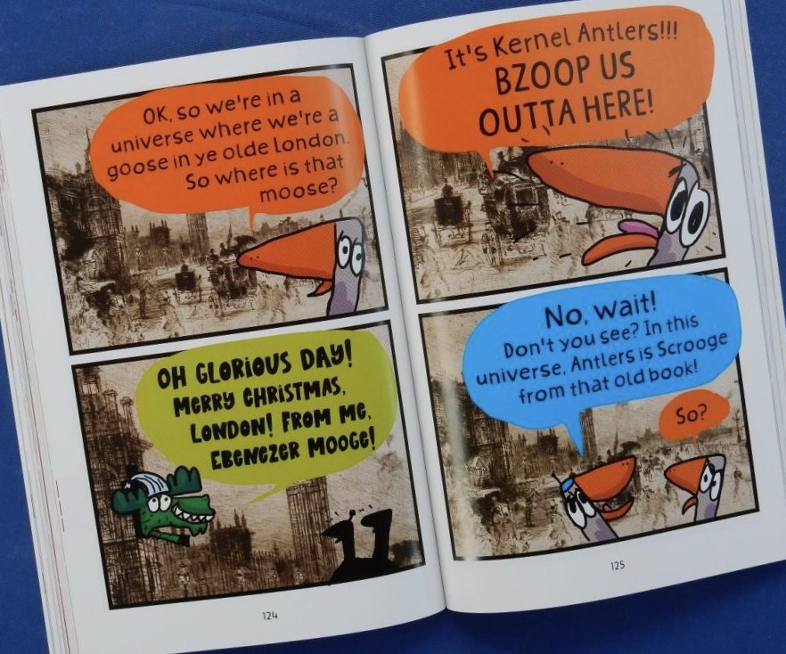 In each chapter they travel to a different universe in the multiverse, courtesy of the rechargeable Astrocap, invented and worn by the cleverer head. With a “Bzoop.”this device transports them out of every dangerous situation in just 42 seconds, the intention to find a spot where the moose doesn’t exist. The chase has halts in universes that pastiche Harry Potter and Charles Dickens.