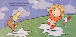 Using the well-known line from Elizabeth Barrett Browning as a starting point, Bauer uses comparisons with aspects of the natural world to show that parental love is ever present. ‘I love you as the thirsty duck loves a sudden shower.