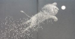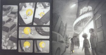 Cinematic in feel, this story is superbly paced by the clever use of panelling on some of Yoko Tanaka’s spreads. The graininess and greyness of her illustrations add to the dreamlike quality of ‘dandy-lion’s’ joyful adventure, underlying which is the life-cycle of a dandelion plant.